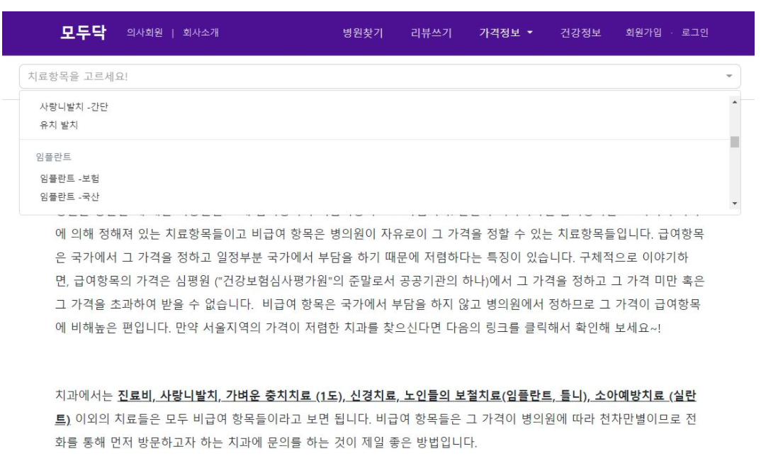 상단의 가격 정보를 누르고 치과를 선택하면 치료 항목이 나타납니다.