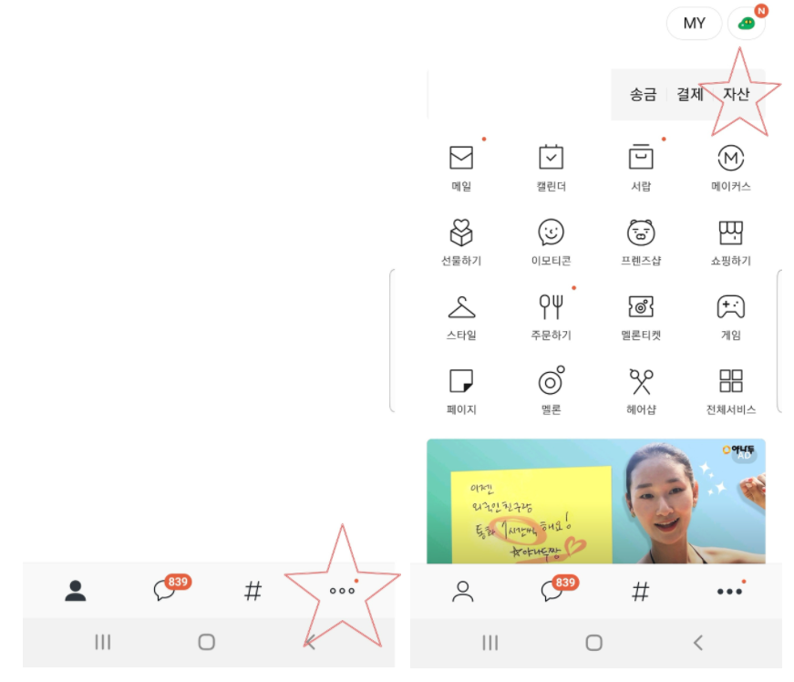 1. 카카오톡을 시작한 후 오른쪽 하단 메뉴를 클릭합니다.